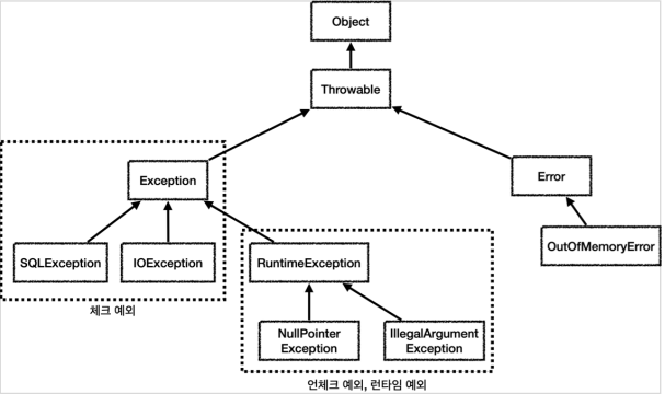 Exception과 그 하위 예외는 모두 컴파일러가 체크하는 체크 예외로 RuntimeException은 그 밖의 예외다. 체크 예외는 잡아서 처리하거나 밖으로 던져야 한다.