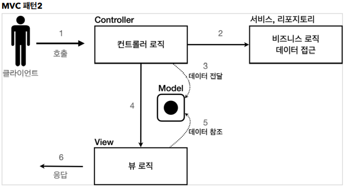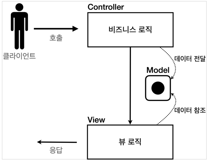 모델: 뷰에 출력할 데이터를 담아준다. 뷰가 필요한 데이터를 모두 모델에 담아서 전달해주는 덕분에 뷰는 비즈니스 로직이나 데이터 접근을 몰라도 되고, 화면을 렌더링 하는 일에 집중할 수 있다.