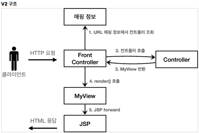 컨트롤러의 반환 타입이 MyView이기 때문에 프론트 컨트롤러는 컨트롤러의 호출 결과로 MyView를 반환받는다. 그리고 view.render()를 호출하면 forward 로직을 수행해서 JSP가 실행된다.