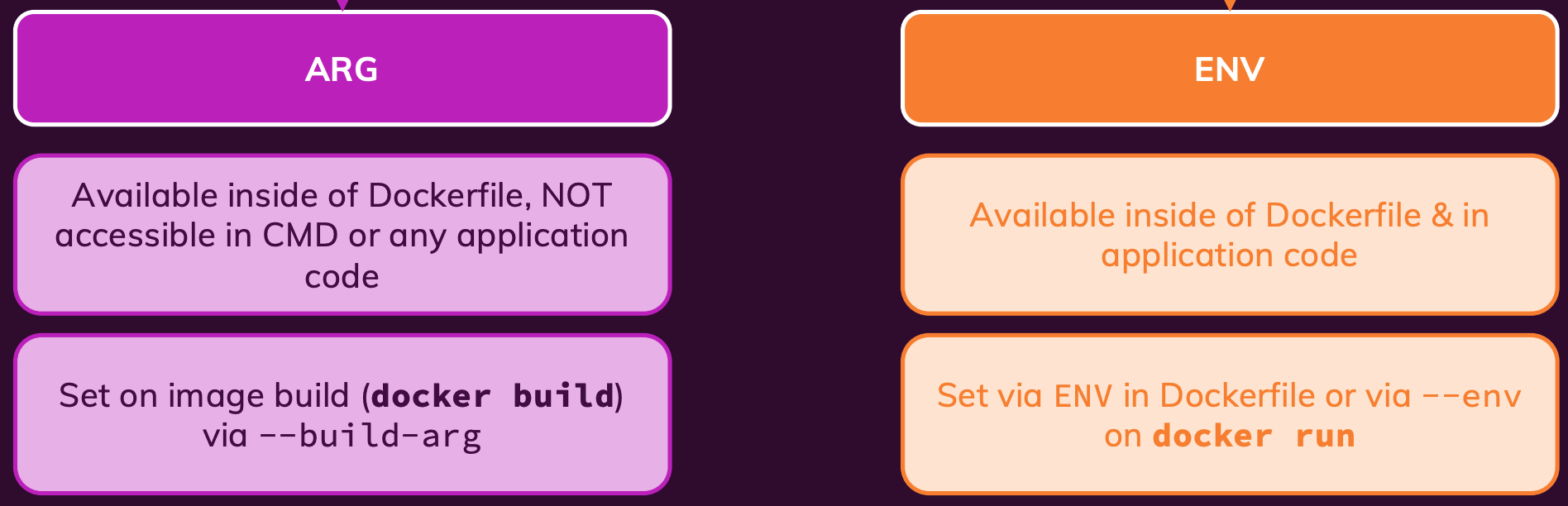 인수는 Dockerfile 내부에서 이미지 빌드 시에 삽입되는 변수이고 환경변수는 Dockerfile이나 컨테이너 실행시에 추가되는 변수로