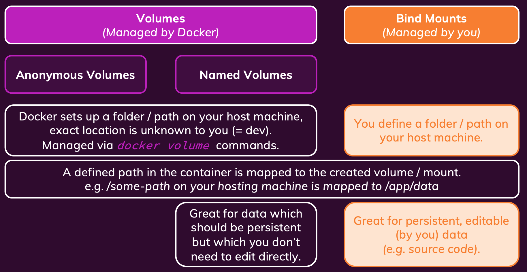 볼륨은 호스트 머신의 폴더와 매핑된 도커 컨테이너 내부의 폴더로 컨테이너나 이미지 안에 존재하지 않는다.